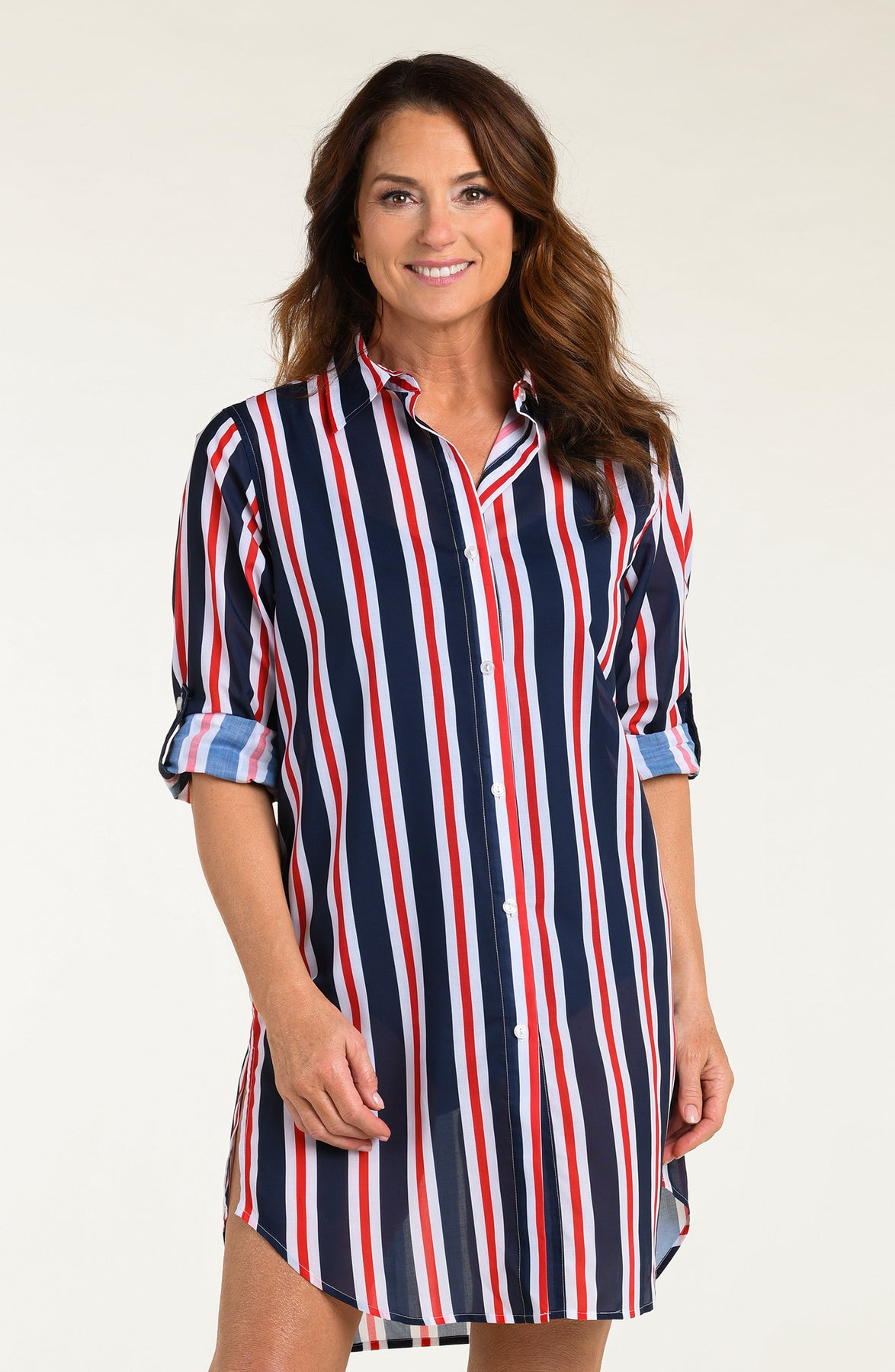 Woman wearing a red, white, and blue striped button down tunic against a white background.